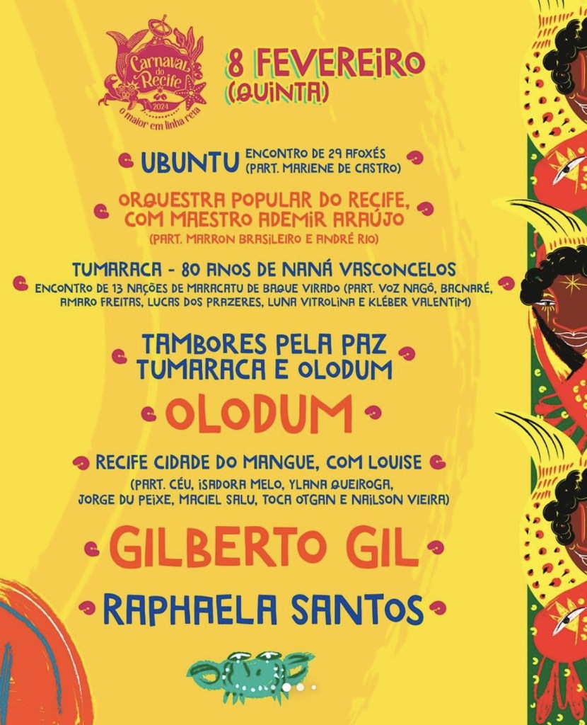No Marco Zero, a grade traz mais nomes que ainda não haviam sido confirmados previamente como Dilsinho, Priscila Senna, Marcelo Falcão e Raphaela Santos. A abertura oficial da quinta (8) traz o inédito encontro entre Olodum e Tumaraca, a estreia do mestre Gilberto Gil na folia recifense e o tributo Recife Cidade do Mangue, conduzido por Louise com participações especiais. Em seis dias de folia, o principal palco da cidade terá mais de 30 shows que celebram encontros, a cultura popular e as diversas sonoridades que fazem a alegria de brincantes em uma quebra de barreiras físicas e geográficas, onde frevo, samba, cultura popular rock e brega convergem para promover a alegria e a confraternização que fazem do Carnaval do Recife o maior em linha reta.